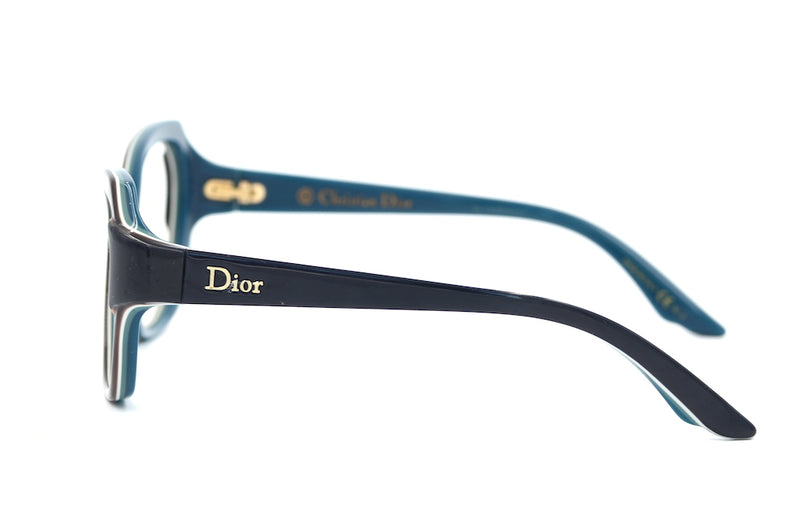 Dior Zaza2, manufactured in Italy. This acetate Christian Dior frame was originally intended to be a sunglasses frame, however we think it also looks fabulous as a pair of spectacles, either or. The front is brown with teal and white detailing towards the inside edge.The sides are a very dark indigo/blue and feature the Dior emblem. The shape is gorgeous, and this frame would work very well for someone who requires a larger width frame. A fabulous price for a beautiful frame.