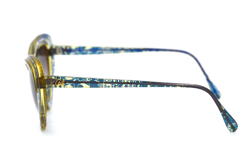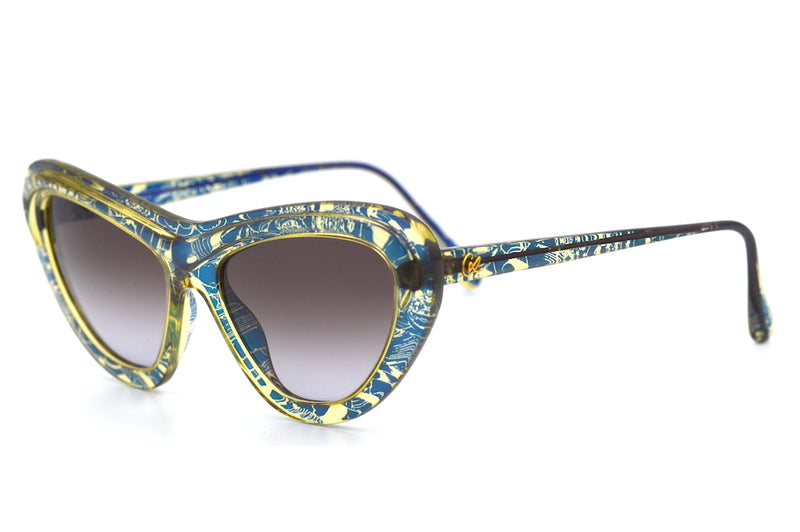 Lacroix sweetie !! New old stock Christian Lacroix 7367 vintage sunglasses in colour 50. This blue and yellow acetate frame features a purple iridescent finish when moving. The cat eye shape is super stylish and the temporal sides feature the Christian Lacroix emblem. This lenses are brown, graduated and have UV protection. This frame is also suitable for Custom lenses.