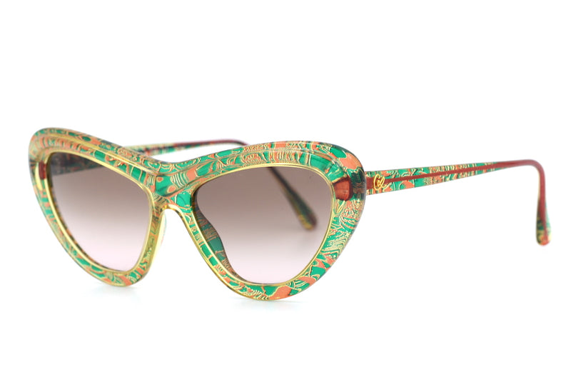 Lacroix sweetie !! New old stock Christian Lacroix 7367 vintage sunglasses in colour 60. This green and pink acetate floral frame features a crystal overlay. The cat eye shape is super stylish and the temporal sides feature the Christian Lacroix emblem. This lenses are brown, graduated and have UV protection. This frame is also suitable for Custom lenses.