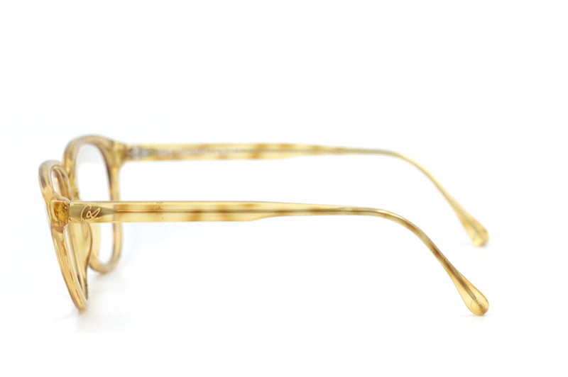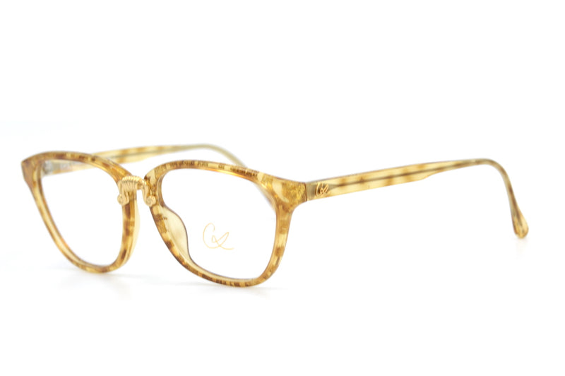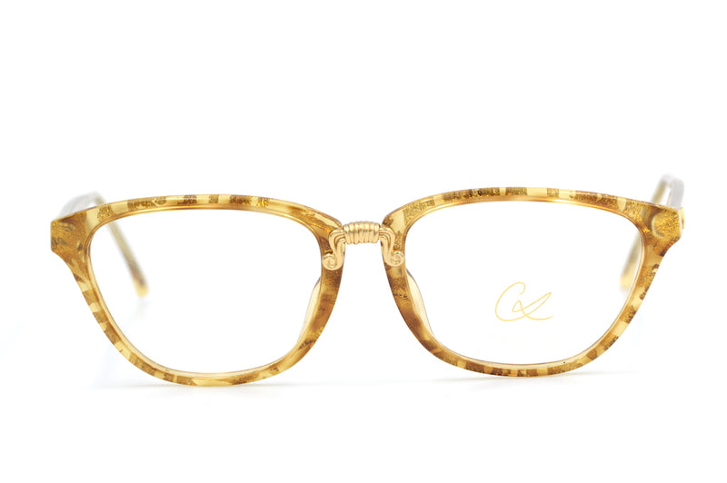 Christian Lacroix 7393 vintage glasses in colour 11. This gorgeous frame is made of light amber Optyl and the front is filled with gold glitter flecks. The gold ornate bridge is typical of the Christian Lacroix brand. The left temporal side features the Lacroix motif, the right side is missing but is not noticeable (only on very close inspection in good light four tiny holes- reflected in price). A lightweight, hypoallergenic and durable material, perfect for the fashion conscious sustainable shopper.