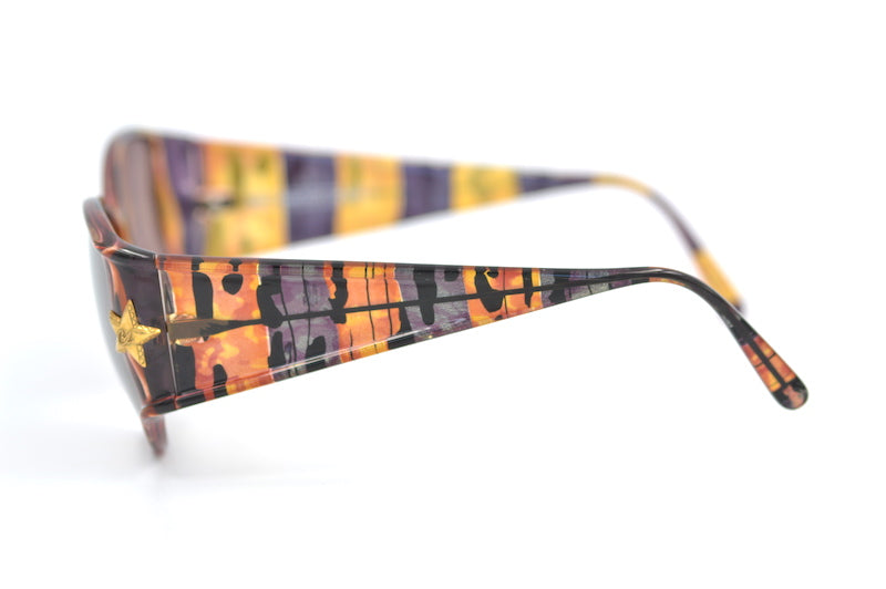 Christian Lacroix vintage sunglasses, model 7414 in colour 80. As with all Christian Lacroix sunglasses, it is the detail that makes these beautiful frames so desirable. It is clear to see the baroque influence, intricate detail and use of pattern throughout. This frame features wonderful autumnal colours and the classic Lacroix star detail on the front temporal edge. The lenses are oversized and complimented by the broad temporal sides. The lenses have a brown tint and provide 100% UV protection.