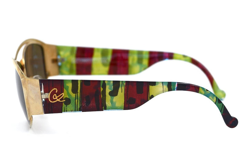 Lacroix sweetie !! New old stock Christian Lacroix 7417 vintage sunglasses in colour 46. This gold metal front is paired with broad acetate temporal sides. The front features a strong brow and the temporal sides help to provide greater coverage from the sun. The temporal sides have a fabulous mix of green and red colours and the Christian Lacroix signature can be seen in gold metal. The lenses are brown, absorb approximately 85% of light and have UV protection. The frame is in excellent condition, with just a few minor storage scratches to the metal temporal edge. This frame is also suitable for Custom lenses.