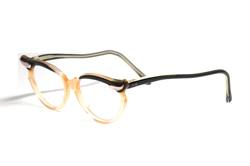 - Clara is an original 1950's acetate vintage cat eye glasses frame. A crystal bridge and lower rim is complemented with a black polka dot brow, which features a beautiful rose gold detail. The polka dot sides are curved and feature two rivet pins. This original vintage frame is in good condition showing signs of slight wear.