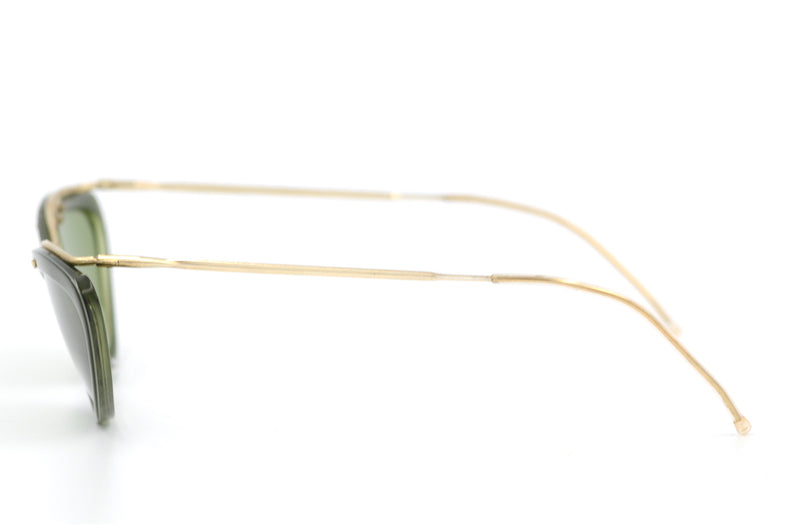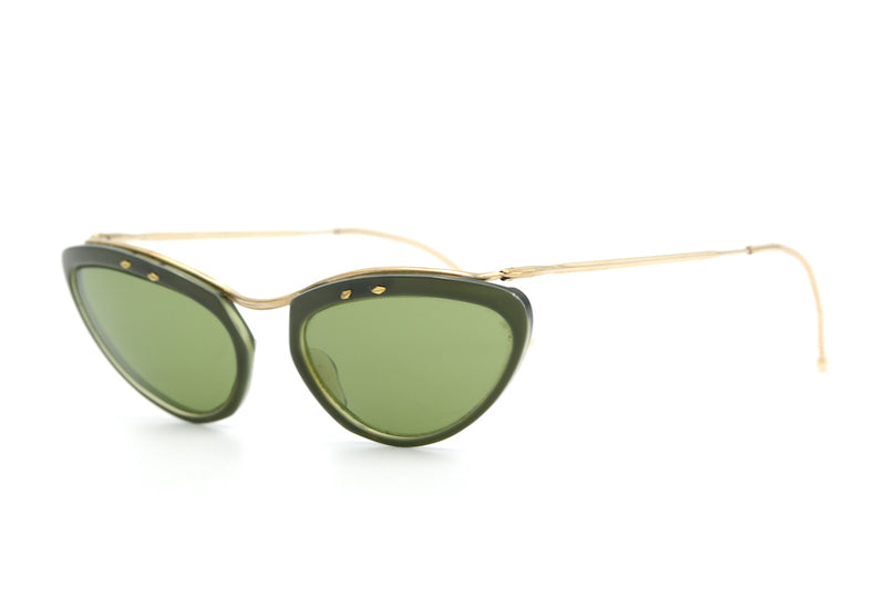 In excellent condition with little sign of wear we have these original Club Cat 1950's vintage sunglasses. Green acetate front rims are supported by the gold brow bar and temporal sides. The lenses are originals, made of glass, with a green tint and 100% UV protection. A few tiny scratches on the lenses, but visibility is in no way affected. Stylish vintage sunglasses from the 1950's.