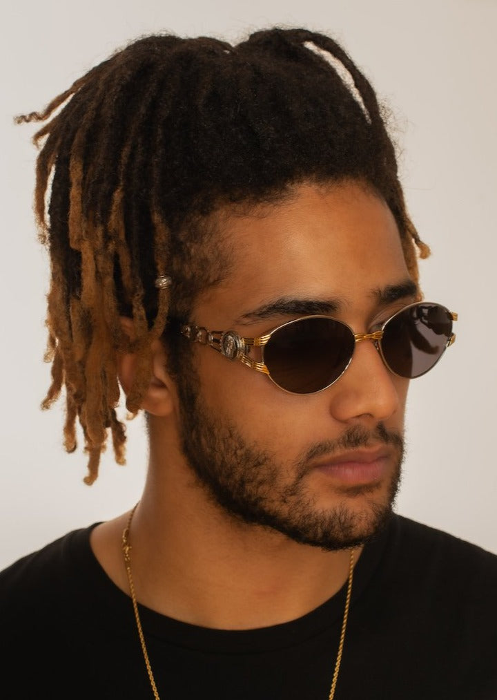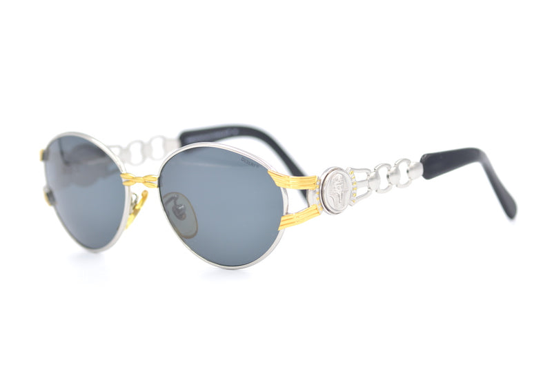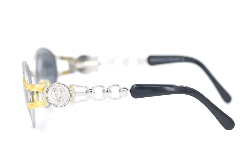 We are going wild for these amazing Desert 2100 vintage sunglasses. A rare brand that is hard to come by. Manufactured in Italy in the 90's they have a Versace like style to them. Lot's of detail to the temporal side including the Pharaoh, which is synonymous to the brand name. Grey lenses provide 100% UV protection. A stylish unisex frame. The combination of silver and gold detail is refreshing and suits most.