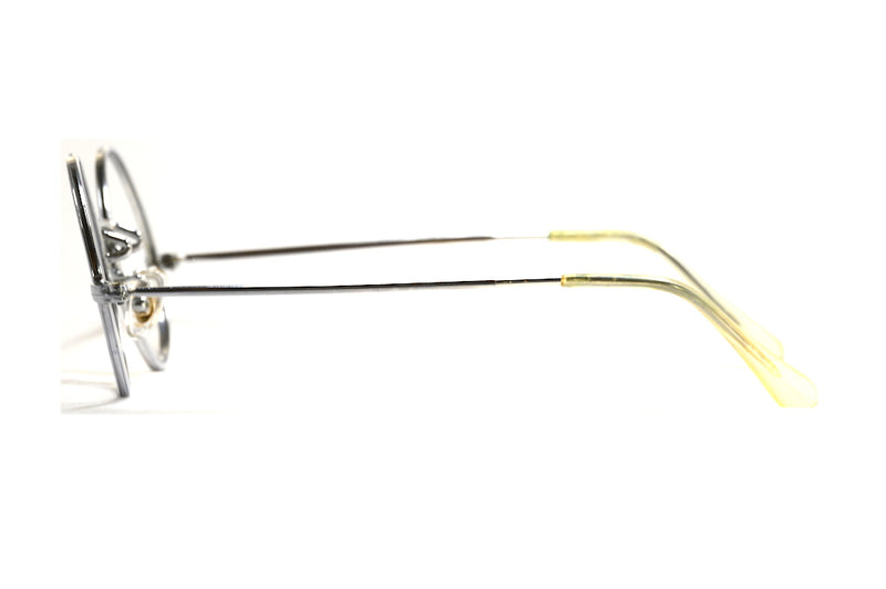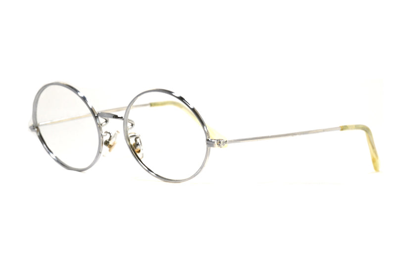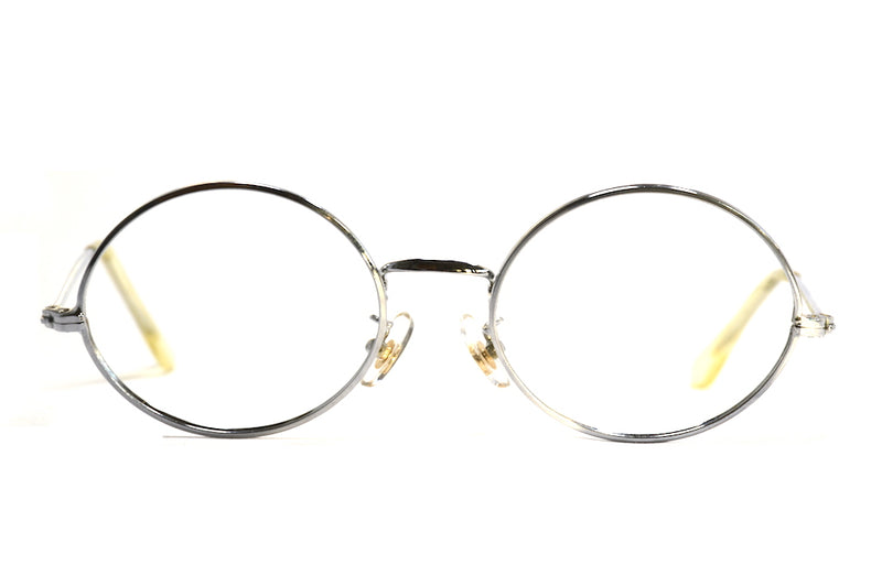 Mid century silver oval vintage glasses. This polished metal frame, features mid set temples, adding good height to the frame. Toggle pads allow further adjustment to help enhance the fit of the frame. Classic styling and on trend this frame is a good addition to any eyewear collection.