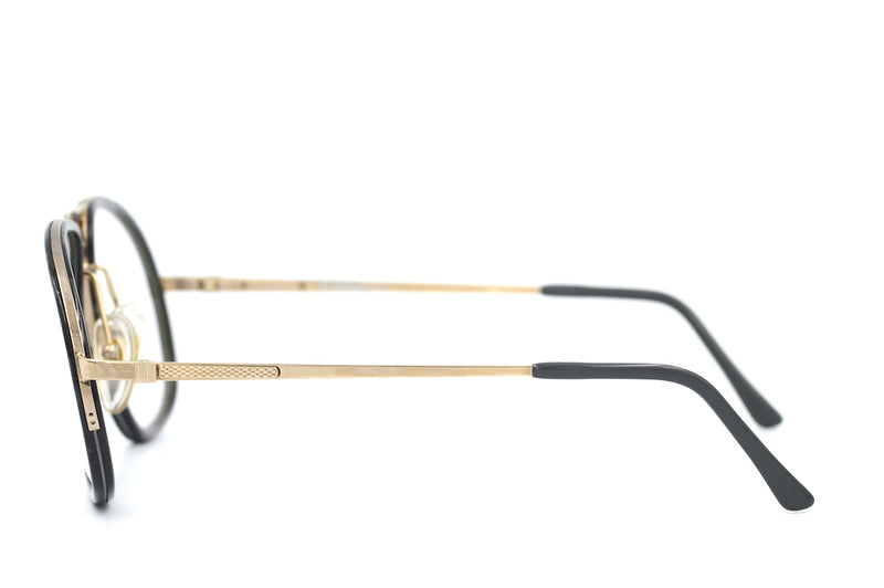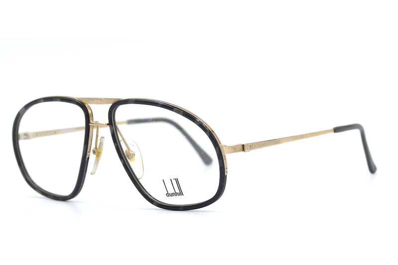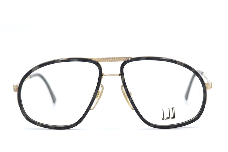 New old stock Dunhill 6093 in colour 20. This rare vintage aviator has a few great features including the way the metal frame envelopes the grey mottled Optyl front, particularly when looking down on the frame. A nice and unusual detail is the supra cord that supporting the lower lens. The bridge and temporal sides have a checker plate metal build. The detail and quality of this frame epitomises Dunhill. The frame has toggle pads to allow greater adjustment to the frame. The Dunhill emblem can be seen on each side. These stylish high quality vintage glasses reflect the essence of the British luxury brand which supplies exclusive menswear and accessories for the discerning gentleman.