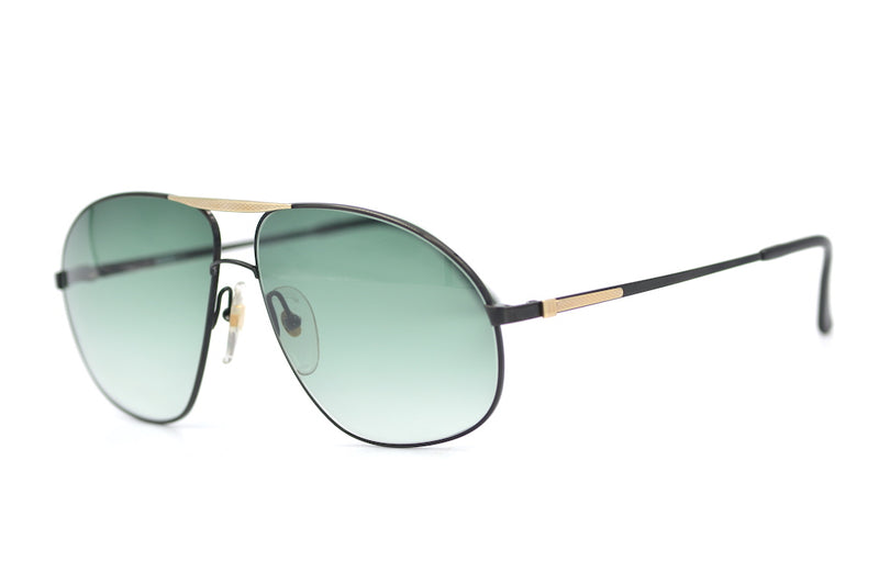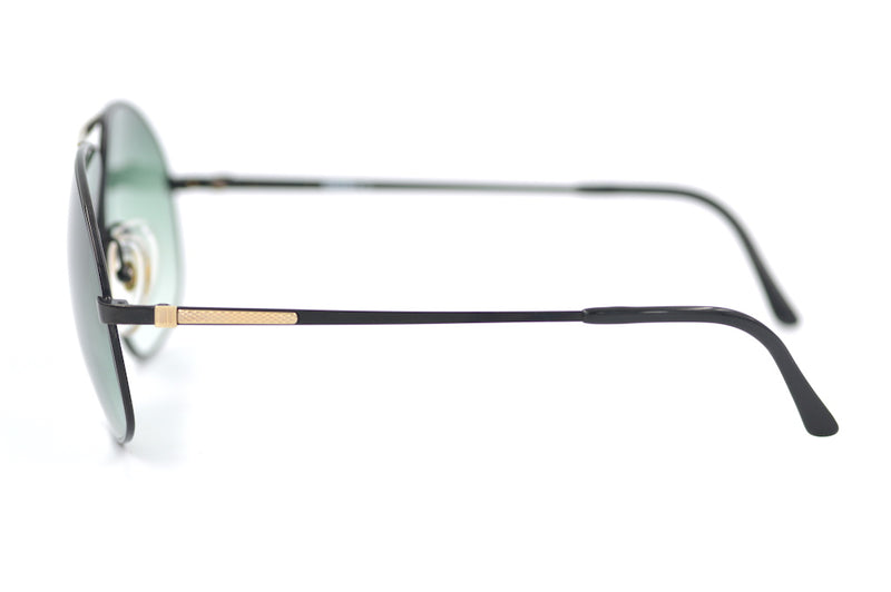 Dunhill 6098 94 vintage sunglasses. Manufactured in Austria in the 80s. A cool retro shaped aviator made by master craftsman. Black rims are highlighted by the gold checker-plate double bridge. The temporal sides feature the Dunhill signature and again that classic checker-plate detail. G15 graduated lenses provide 100% UV protection. Suitable for prescription lenses. These high quality vintage sunglasses reflect the essence of the British luxury brand which supplies exclusive menswear and accessories for the discerning gentleman.
