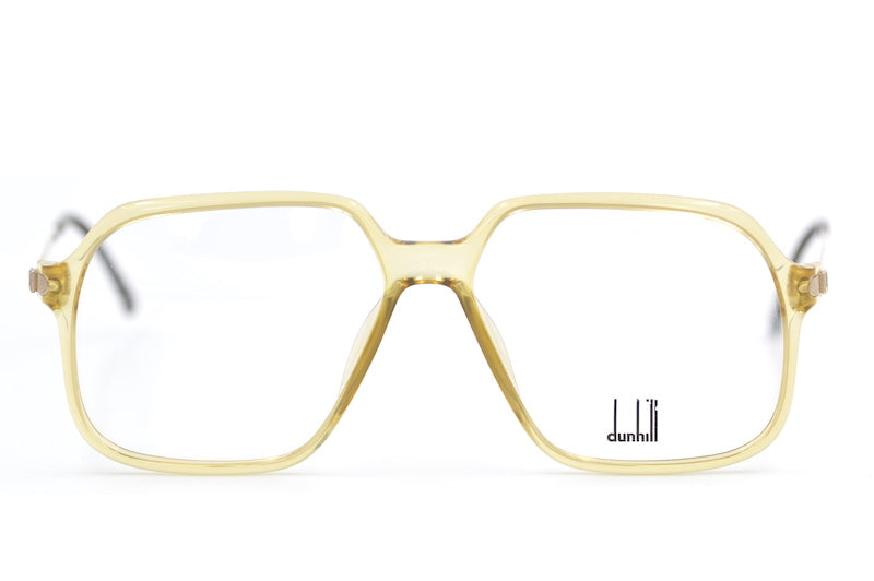 New old stock Dunhill 6108 in colour 60, transparent off white glasses. This original vintage frame shot to fame, when it was seen on Jay Z back in 2009 in another colour. Manufactured in Germany in 1990 the frame comes with the original demo lenses. The front is made of Optyl, a lightweight, hypoallergenic material, the temple sides are gold metal, featuring the distinctive Dunhill emblem and diamond pattern. These stylish high quality vintage glasses reflect the essence of the British luxury brand which supply exclusive menswear and accessories for the discerning gentleman. Shop the best selection of mens designer glasses online at Retro Spectacle. Custom lenses available with this frame from £29.00.