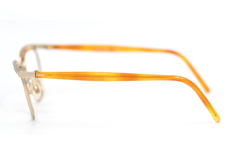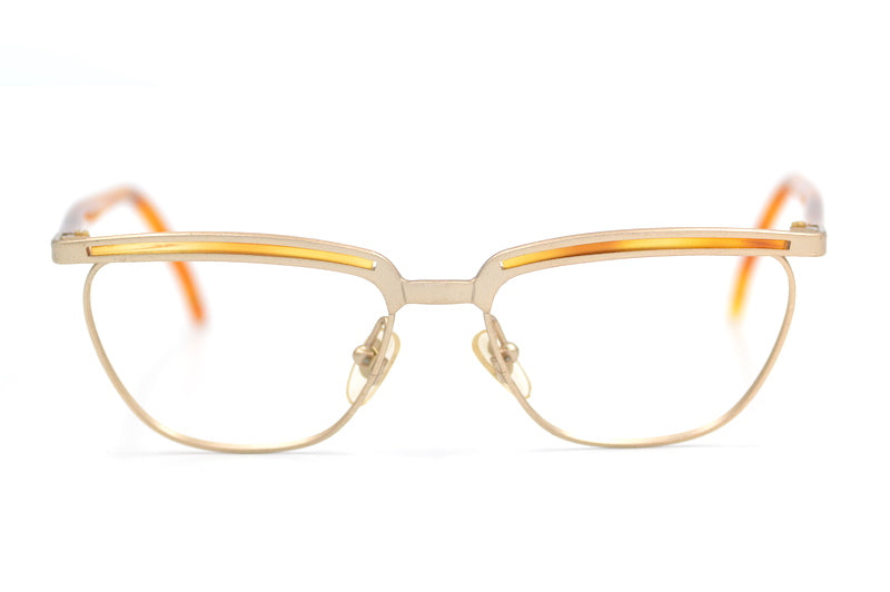 New unused vintage stock, we have Enrico Coveri 216 in colour 910. This women's petite cat eye glasses frame is made of gold metal, with amber mottled acetate sides. Toggle pads on the bridge allow a more custom fit. Manufactured in the 80s, the Italian fashion brand still exists to this day.