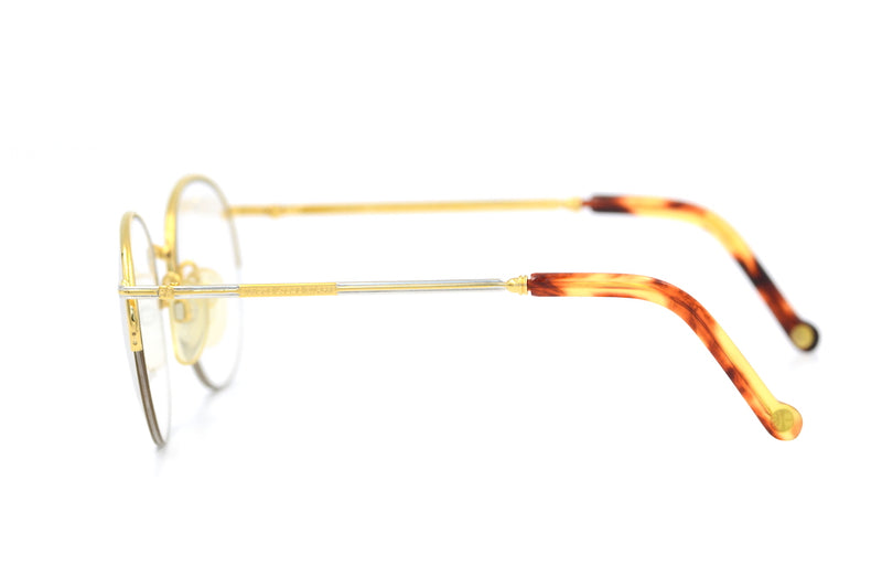 Clotho in colour 102 is a fabulous unisex round frame. Manufactured in the 1980's this model is 22kt gold and platinum plate . The lens is supported by a Nylon supra cord. The temporal edge features the ELK emblem and the sides display the signature. We highly recommend our Super Strong lenses for these frames, to prevent any chipping or damage to lenses with wear.