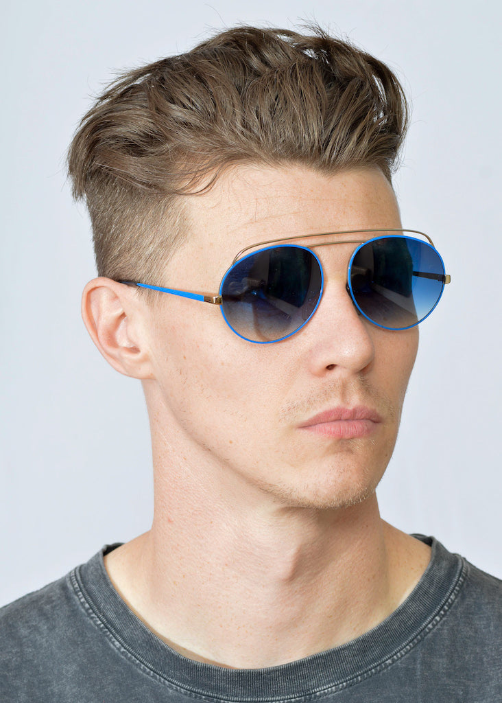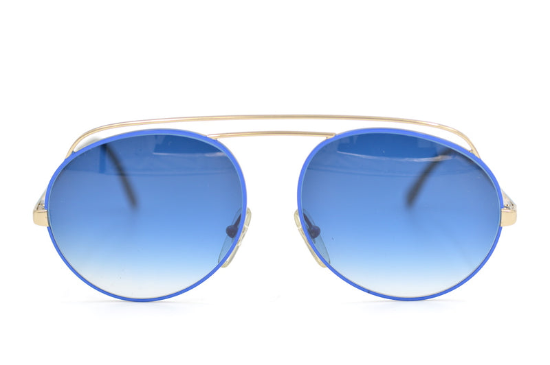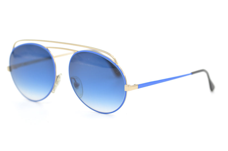 Make a statement with Etiquette Nueticks 3 in colour 402. This stunning, unusual frame is round with a double brow bar and finished in blue paint. The graduated lenses are also blue, creating a unique finish and provide 100% UV protection. There are 2 minute scratches which can only be seen on very close inspection and have been reflected in the price of this rare unique frame.