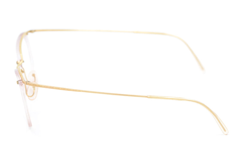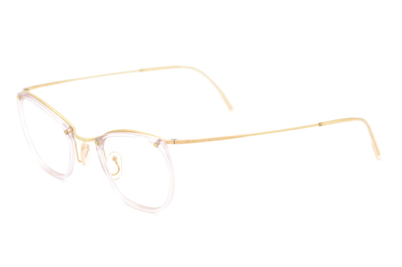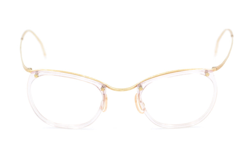 Good things come in small packages, and that is most definitely the case with this new old stock original 1940's vintage spectacle frame. Manufactured in France by Etoile, this beautiful frame is truly beautiful. Crystal acetate front rims are supported by gold filled brow and temples which have intricate filigree detailing. Suitable for Custom lenses, or just something to be adorned, this petite frame will not disappoint.