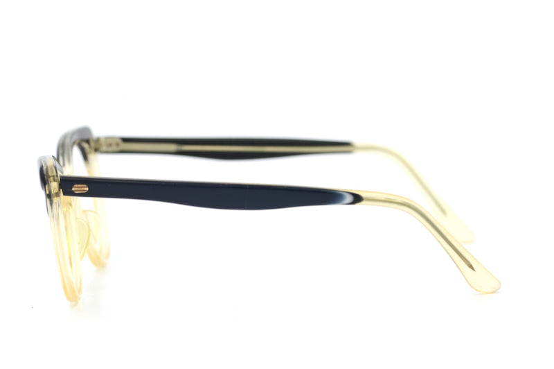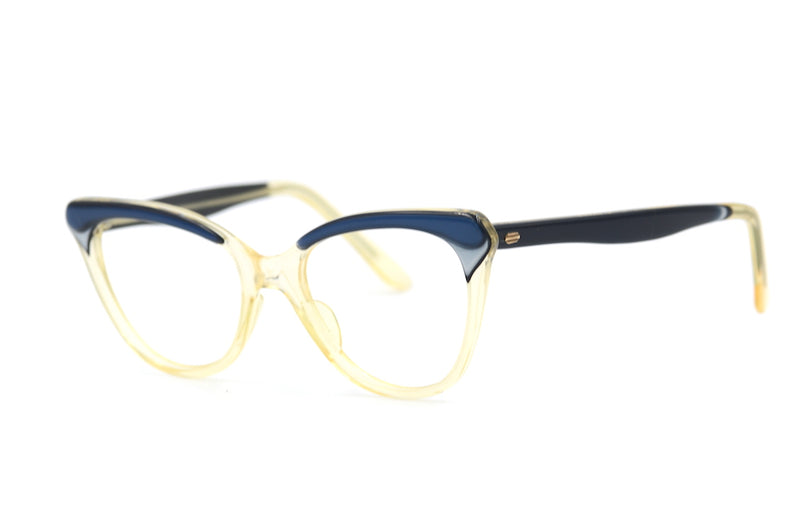 In excellent vintage condition with sign of light wear we bring you Eylsees by BMR. This original 1950's glasses frame features a combination of crystal and blue acetate. The cat eye shape is a popular style and gold rivet detailing can be seen on the temporal sides.