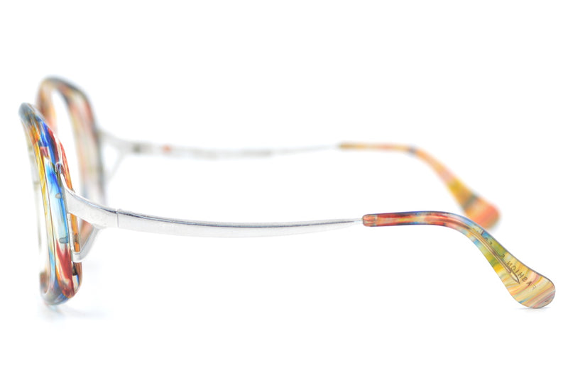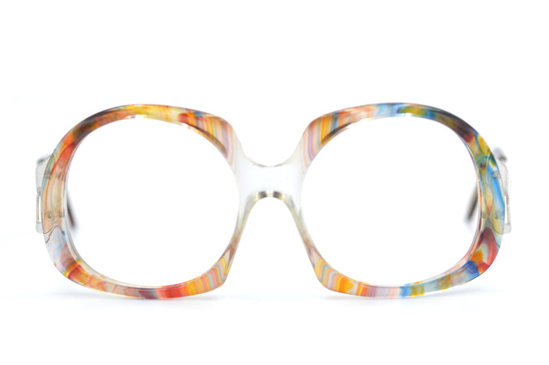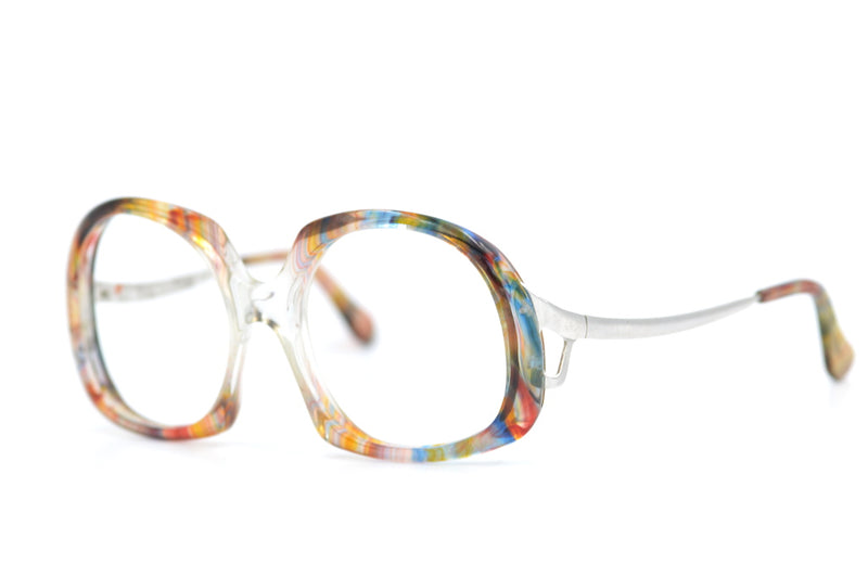 Fashion Five is a phenomenal example of authentic 70's eyewear. A mix of colours float through the crystal acetate like a watercolour paint swirls through water. The tapered temporal sides are mid set and made of polished silver metal. A stunning frame not to be missed.