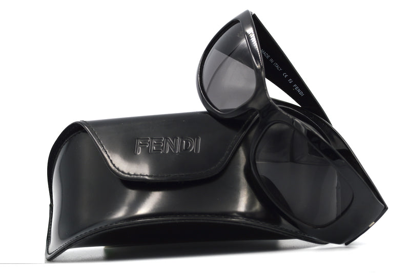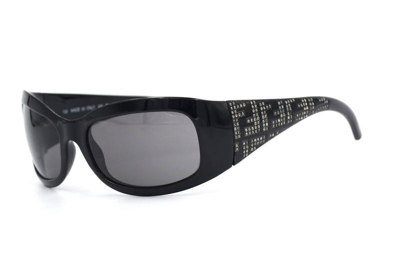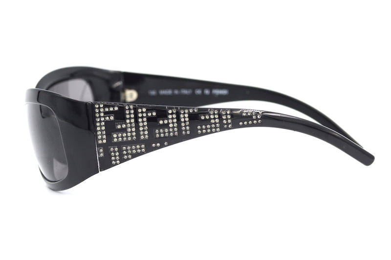 Get the Charli XCX Brat sunglasses look this summer. New old stock limited edition Fendi 299R sunglasses in colour 001. This fabulous designer sunglasses frame comes with it's original case. Made of black acetate this wrap around frame offers lots of coverage and protection from the sun, sitting close to the face. Grey lenses have 100% UV protection. This limited edition model has the temporal sides covered in diamantés in the famous Fendi pattern.