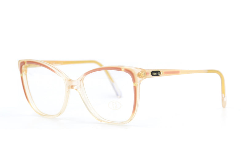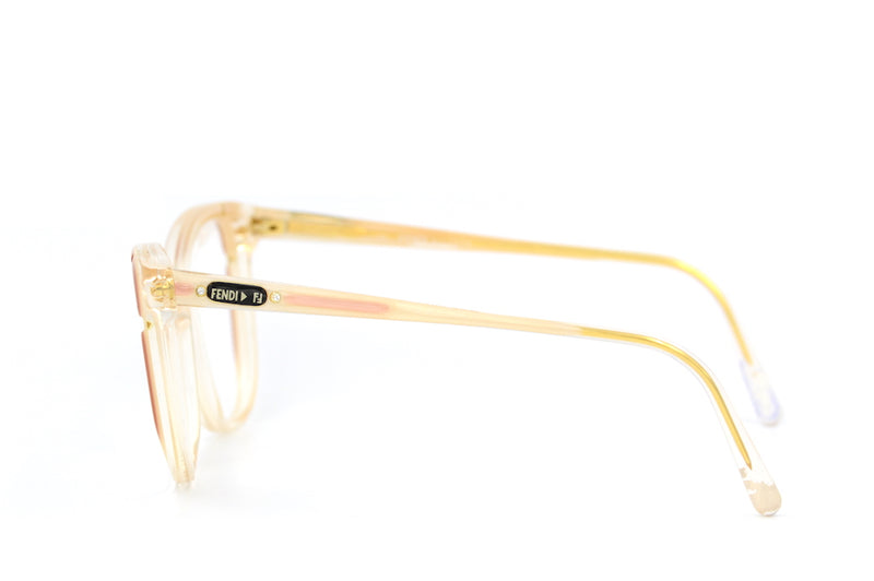 New old stock Fendi by Lozza 20. Manufactured by Lozza in Italy this fabulous pair of vintage designer glasses is in superb condition. The frames is made of acetate and features diamante detail to the front edges. The temporal sides have the Fendi signature and emblem. A feminine vintage frame with crystal, cream and pink acetate. Fun, flirty & super stylish.
