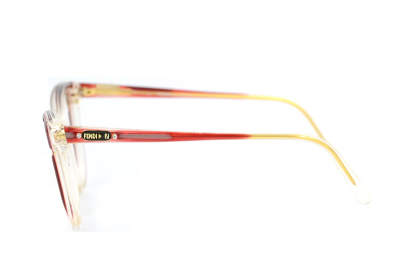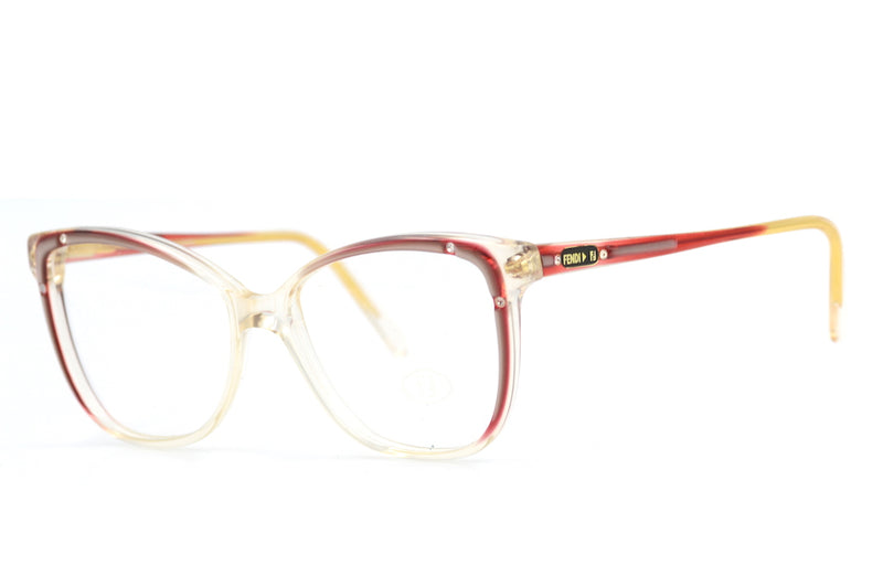 New old stock Fendi by Lozza 20 vintage glasses in colour 757. Manufactured by Lozza in Italy this fabulous pair of vintage designer glasses is in superb condition. The frames is made of crystal acetate and features red and sliver edges along diamante detail. The temporal sides have the Fendi signature and emblem. A feminine vintage frame on trend. Shop women's Fendi glasses online at Retro Spectacle.