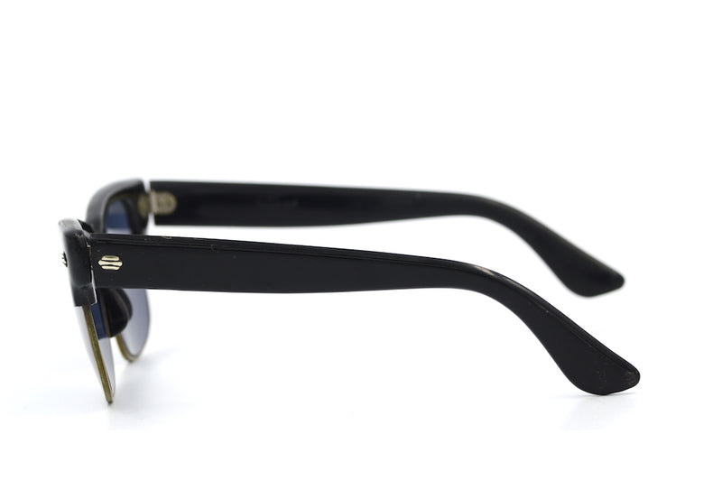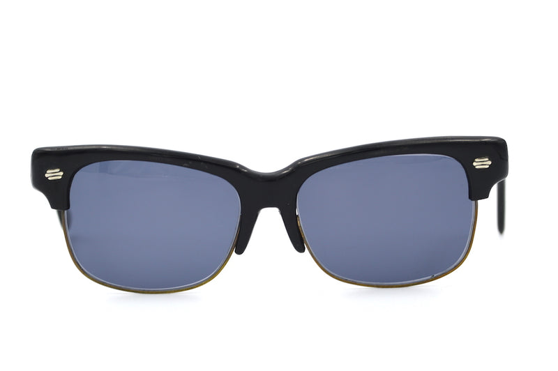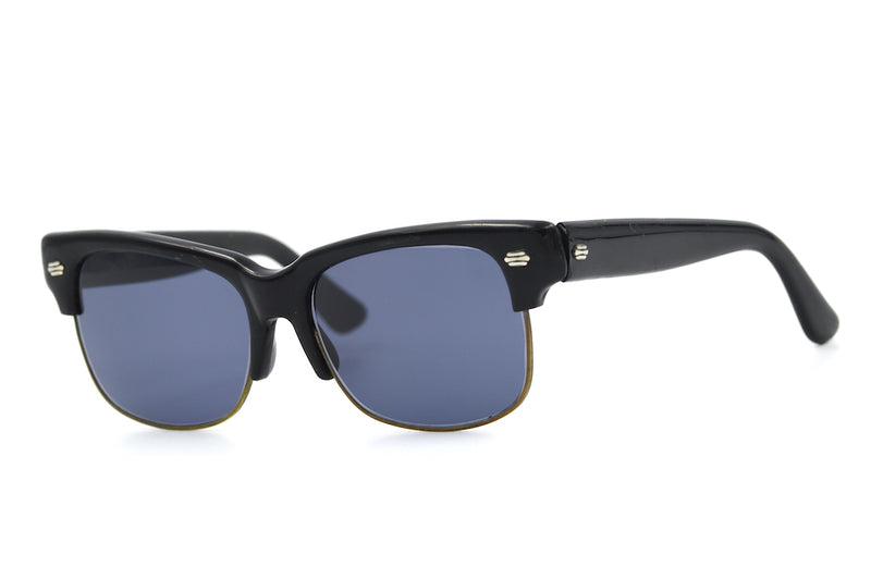 Foreign Sun is an original vintage sunglasses frame, which has been fitted with new grey lenses with 100% UV protection. The frame features broad black acetate temporal sides and brows. Decorative silver rivet detail is visible. This frame is a generous size and functional, despite signs of surface wear. Original vintage sunglasses, not to be missed.