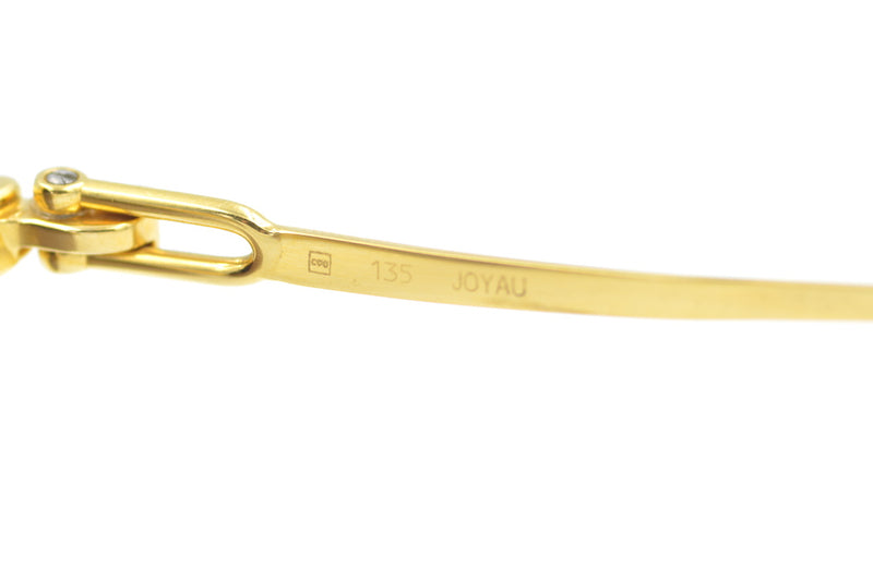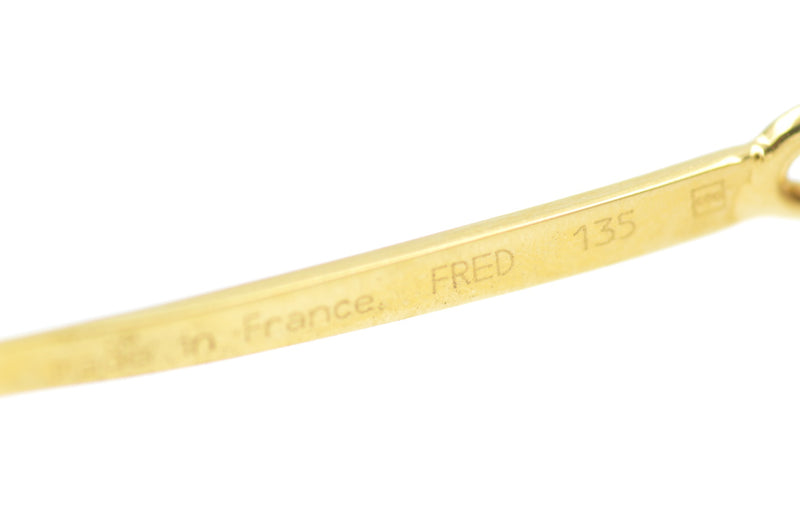 • New old stock Joyau by Fred. Continuing with the sailing theme of the brand the signature buckle is present at the temporal sides. Brown lenses provide 100% UV protection. The original demo lenses are also included with this frame. The frame is 22KT gold plated and has been created by master craftsman. This feminine oval shape features marble lacquered detail to the front and temporal sides. Each frame in the Fred collection is unique and serial number is engraved on the right inside hinge.  Luxury vintage eyewear not to be missed.