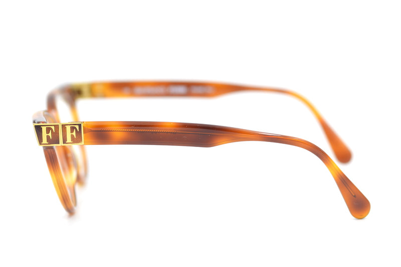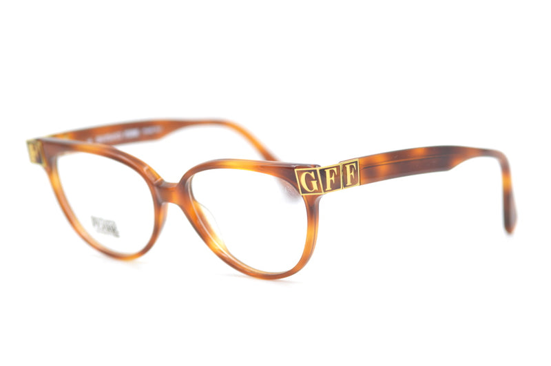 Gianfranco Ferre 106 in amber mottled acetate. This vintage frame was manufactured in Italy in the late 80s. The branding is edgy with the GFF initials on either side of the frame. The shape has an elegance about it and the sizing is small/medium fit.