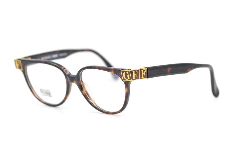 Gianfranco Ferre 106 in brown mottled acetate. This vintage frame was manufactured in Italy in the late 80s. The branding is edgy with the GFF initials on either side of the frame. The shape has an elegance about it and the sizing is small/medium fit.