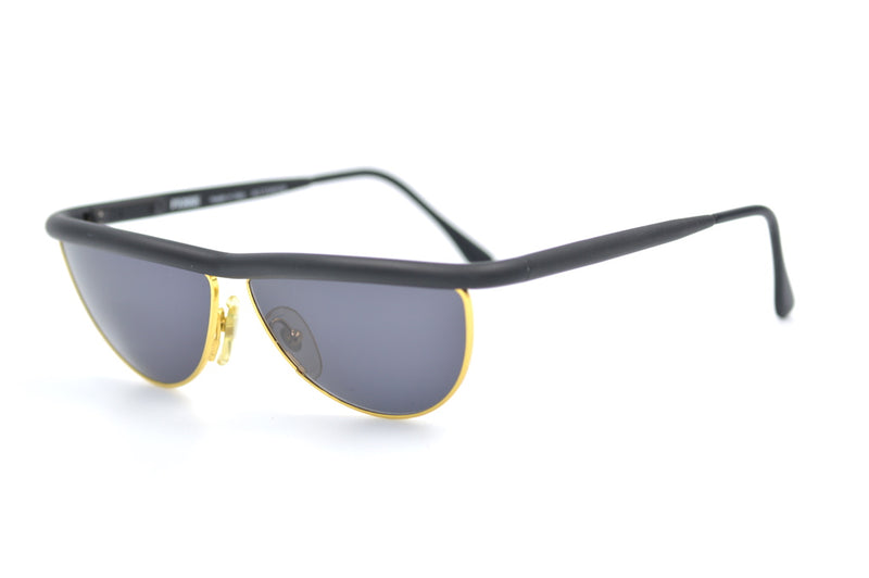 New old stock Gianfraco Ferre 31/S vintage sunglasses in colour 582. This fabulous vintage frame has a futuristic feel and the frame is made of aluminium, giving a strong, durable feel. The brow and temporal sides have a matte black finish, the lower front rims polished golf. The grey lenses absorb 85% of light and have 100% UV protection.