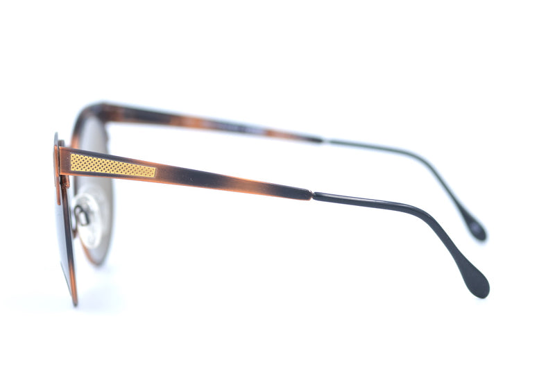 Gianfranco Ferre 85/S in brown mottled metal. with gold detail. This frame was seen on Lady Gaga in a different colour. The round lenses are brown in colour and provide 100% UV protection. Manufactured in Italy in the late 80s. This is a ladies small/medium fit frame.