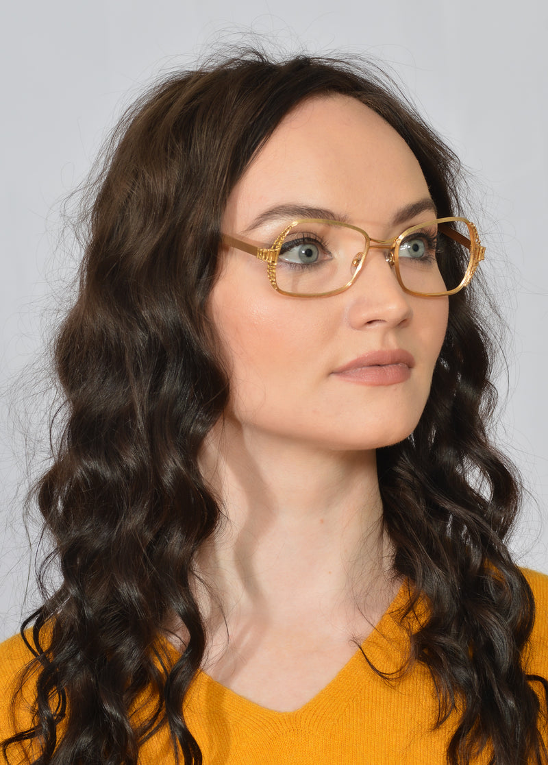 - Ladies gold metal vintage glasses frame with lots of fine detail and character. The sides have a brushed gold finish with brown temple tips. The front of the frame has exquisite detail with texturing on the upper lower and nasal rims. The temporal front rim has a ladder like gold detail which extends round slightly to the side. The frame features adjustable nose pads which are new.