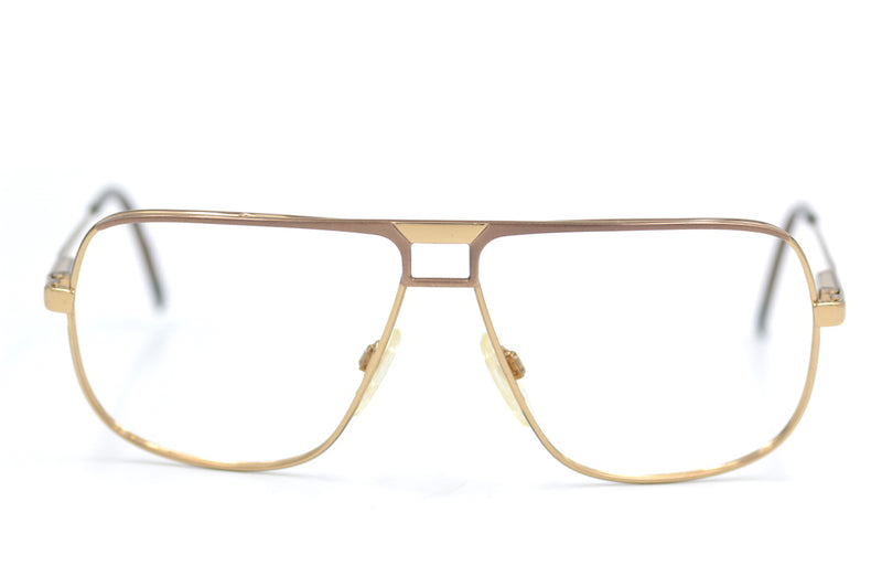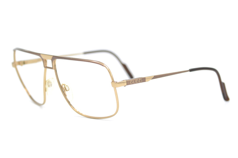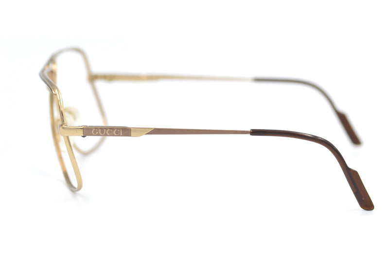 Gucci 1205 in colour 734 is a new old stock frame from the 80s. Manufactured in Italy, this stylish design could look fabulous as glasses or sunglasses. A combination of gold polished metal and brown matte finish paintwork finishes this frame. The Gucci signature can be seen on the temporal sides. A tiny scratch can be seen on the left temporal side, to the left of the branding, but this is not noticeable unless inspecting and has been reflected in the price. Rare vintage glasses at Retro Spectacle.