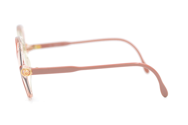 80's Vintage Gucci 2103 in colour 69G. This oversized frame is on trend right now. New old stock in superb condition. The front crystal acetate has a red/brown highlight to the temporal edge. The temporal sides feature the gold Gucci emblem. A keyhole bridge adds additional detail, and the temporals are mid-set adding great height to this frame. A stunning frame not to be missed.