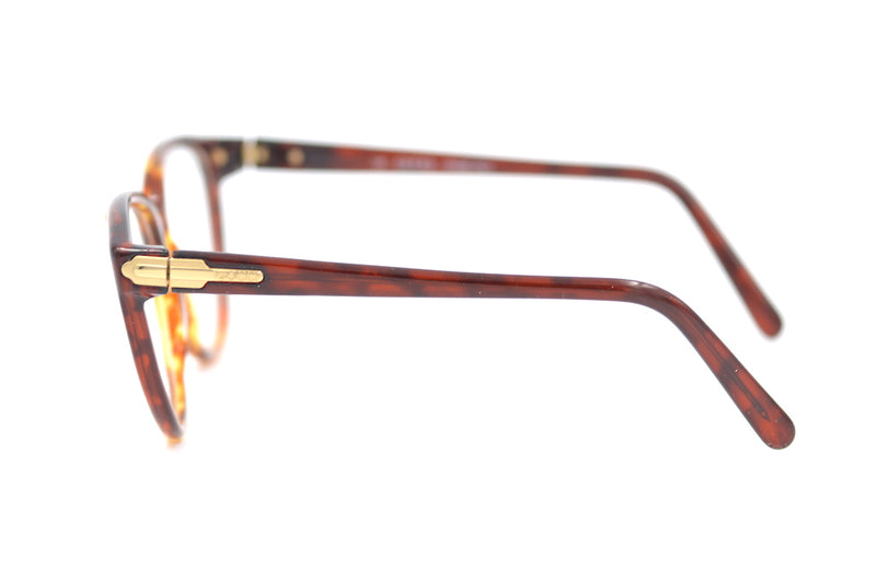 New old stock Gucci 2180 vintage glasses in colour CG6. This upswept frame has a cat eye feel to it. The warm brown mottled acetate frame darkens towards the temporal edge. Gold metal edging can be seen to the temporal sides with the Gucci signature. Manufactured in Italy in the 80s, this really is a stylish sustainable frame. Available in a smaller size on request.