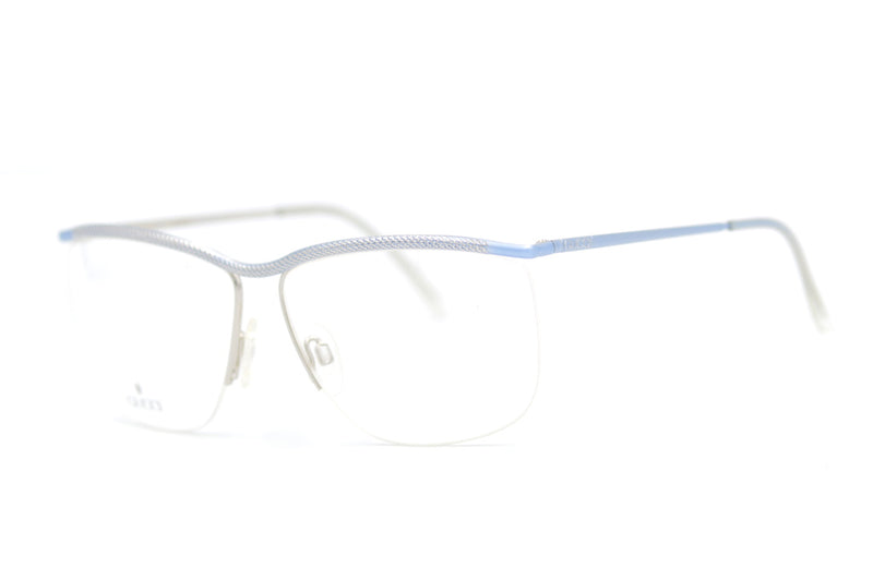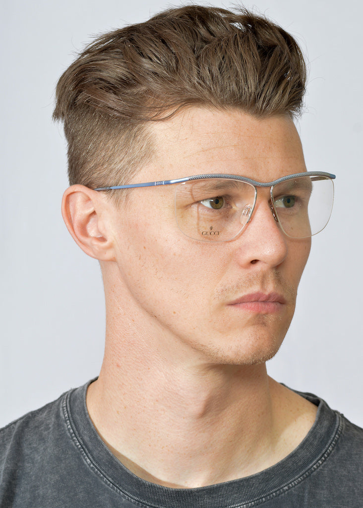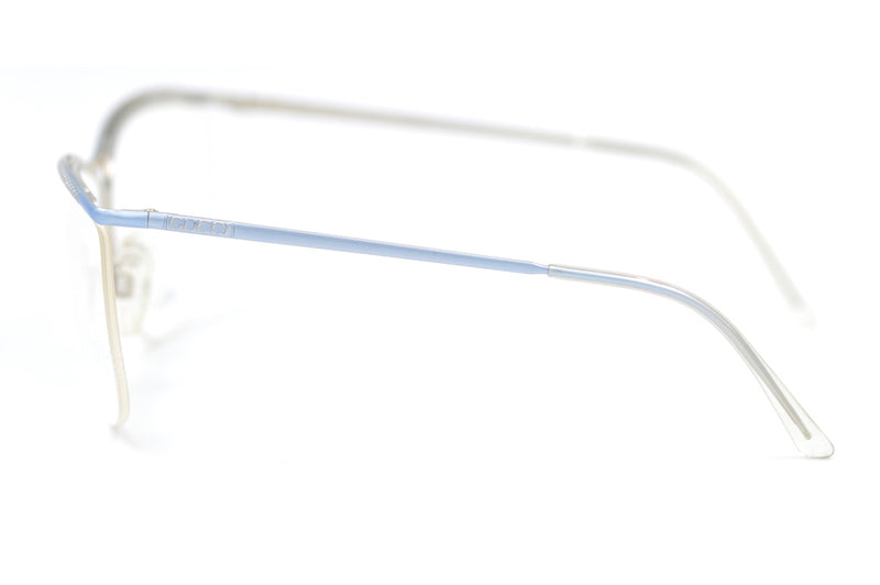 Gucci 2242 vintage glasses in colour 81P. This gorgeous unisex frame is made of metal which is painted baby blue and has silver detail to the gently curved brow. A 80s unisex frame from the fashion house of Gucci. For this frame we recommend you purchase our Super Strong lenses, these prevent the lenses from chipping where not protected by a frame. The right temporal side has two very small superficial scratches to the paint work and could be touched up easily, this has been reflected in the price.