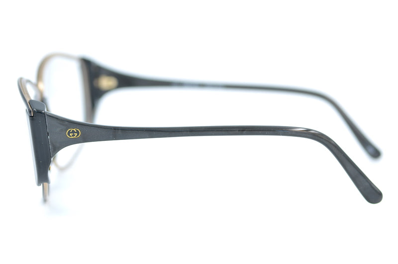 New old stock Gucci 2308 in colour 59T. Manufactured in Italy in the 80s this cool vintage frame features a black metal front with grey marbled bridge, temporal edge and acetate sides. A cool oversized frame with a fixed bridge.for added comfort. The Gucci emblem can be seen on the temporal sides.