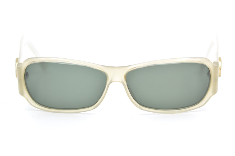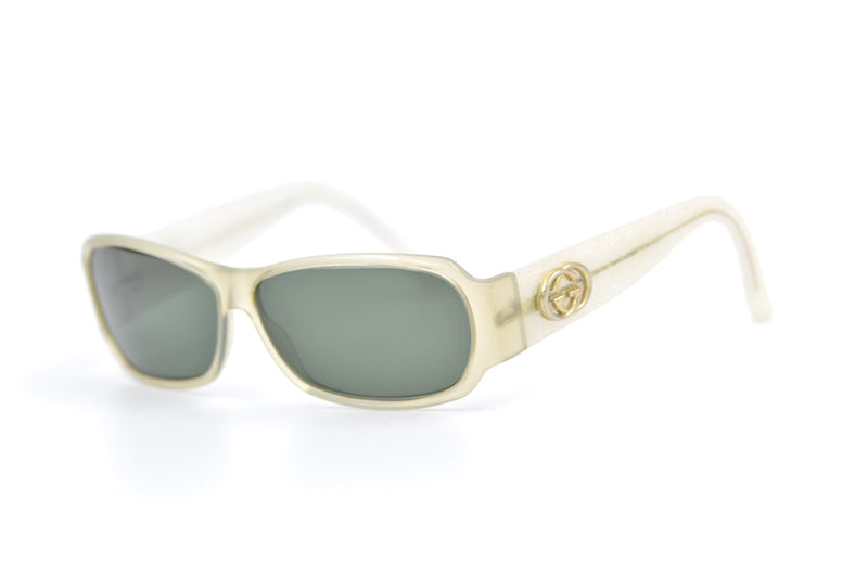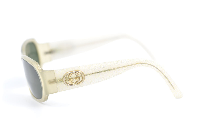 Loving this 90s style wrap round Gucci 2935 sunglasses frame. Upcycled the frame has been fitted with new G15 lenses which provide 100% UV protection. The sides have a gold glitter finish and feature the Gucci emblem. The frame is in great condition with little sign of wear, the most visible mark being a small brown stain within the acetate on the left nasal side see pictures. Cool 90s vibe Gucci sunglasses at a fantastic price.