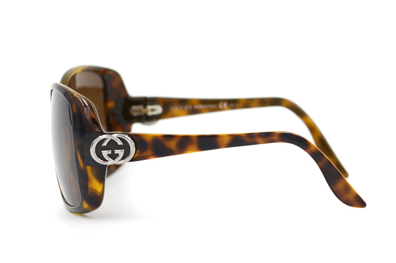 Up-cycled Gucci 3166/S sunglasses. This fabulous oversized Gucci sunglasses frame is in excellent condition with little sign of wear. It has been fitted with new brown lenses, which absorb 85% of light and have 100% UV protection. The frame was manufactured in Italy and is made of a brown mottled acetate. The Gucci emblem is visible on each temporal side in silver. Sustainable, designer sunglasses.