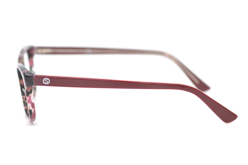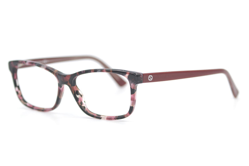 Not vintage but nevertheless a fabulous frame from the fashion house Gucci. In excellent condition with little sign of wear this rectangular frame is made of acetate. Manufactured in Italy, the frame has mix of colours running through the front marbled acetate, whilst the temporal sides are plain maroon and feature the Gucci emblem in silver. Sustainable designer eyewear at affordable prices.