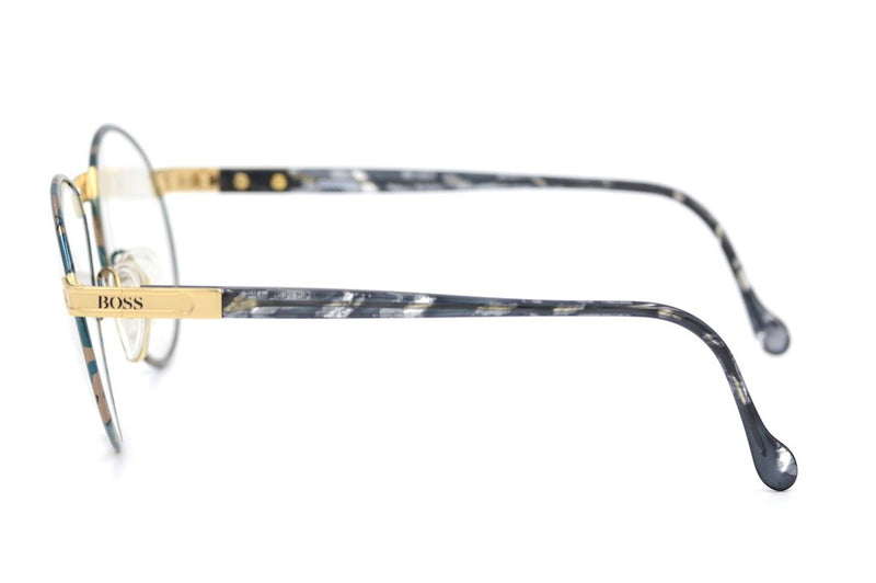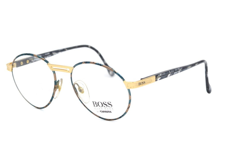 Manufactured in Austria, we have this stunning new old stock Hugo Boss by Carrera 5113 vintage glasses frame in colour 46. So stylish, this frame is just super hot right now. The front metal rims are green and brown camo, smoke grey temporal sides and gold detail to the bridge and temples. The temples feature the Boss branding. New old stock doesn't get much better, a stunning sustainable frame which is back at the height of fashion. Custom lenses available from £29.00.