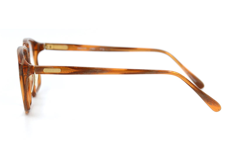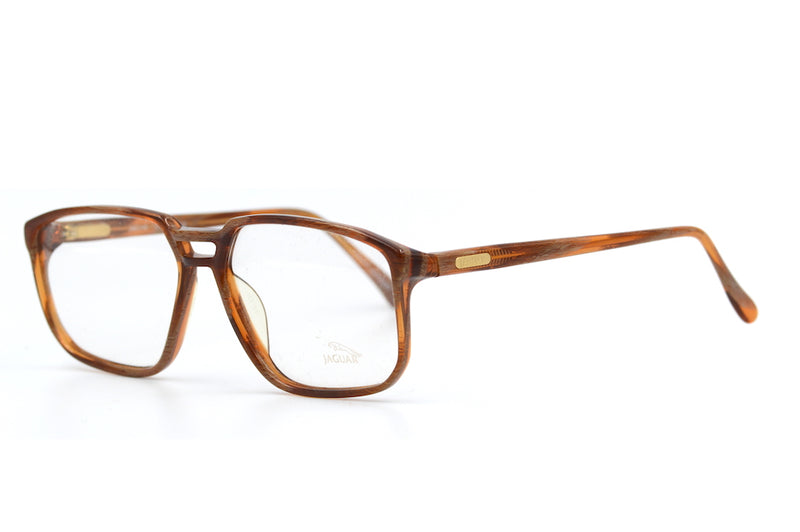 • New old stock Jaguar 103 in colour 510. Manufactured in Germany in the 1980's, this stylish frame is available in two sizes. The brown acetate has a slight marbled effect and a double bridge bar is present for added strength and style. Both temporal sides features the Jaguar signature. A nice stylish frame in a generous size.