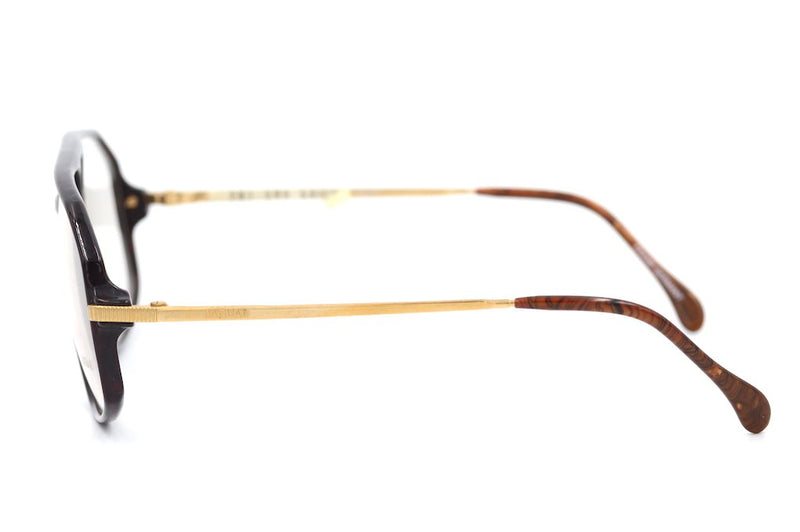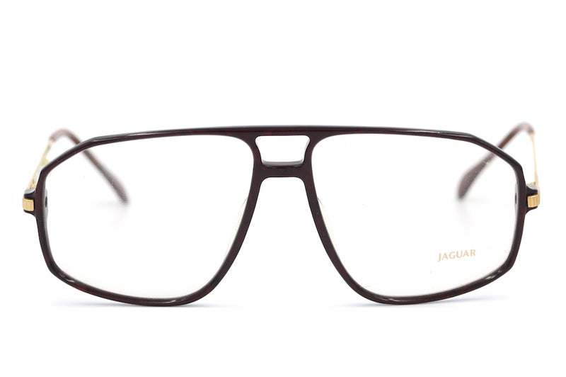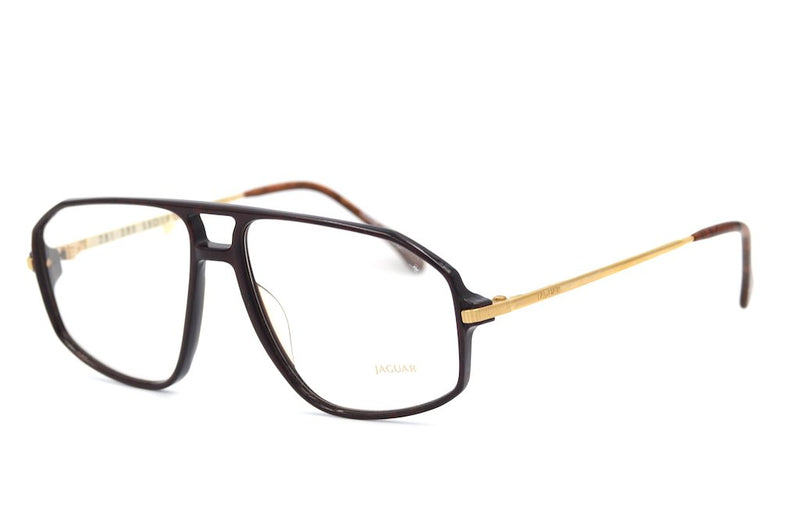 Only 1 left. Manufactured in Germany we bring you this new old stock 1980's vintage Jaguar frame. Jaguar 281 is an original vintage glasses frame from the 1980's. Oversized aviator, typical to the era, this combination frame has a deep brown mottled front and metal temple sides, which have the Jaguar branding. The temple tips are walnut wood effect, a nice touch to the frame. A fabulous frame in excellent NOS condition. This vintage glasses frame would work well as spectacles or sunglasses.