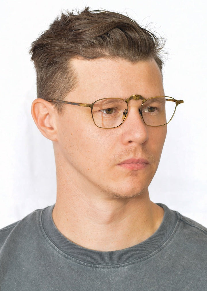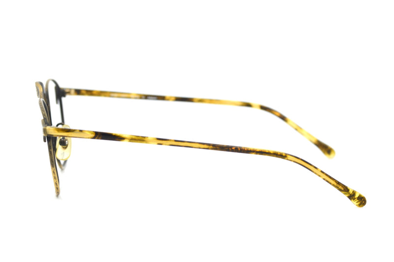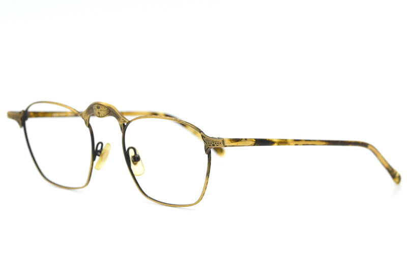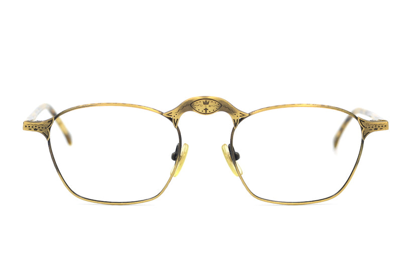 Jean Francois Rey 858 vintage glasses manufactured in Japan. These unusual and exquisite vintage glasses frames are really rather splendid. A combination frame, the front a brass coloured metal, the temple sides are light brown mottled acetate. The frame features a toggle pad bridge, allowing a more customised fit. The beauty in this frame is present in the level of detail applied to the front of the frame. Filigree detailing runs around the lens rims. The bridge detailing features a cross and a crown and the temporal edges have further crown detailing. The bridge is positioned high, as it is for detail, and captures the eye. Custom lenses available from £29.00.