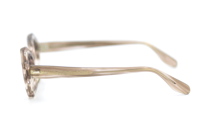 • Jemima rare vintage mid century glasses. The manufacturer is unknown. Smoke brown acetate creates a lovely effect. The temporal reinforcements can be seen through the plastic and have a hammered effect, which also adds detail. The frame shows very little sign of wear. Authentic vintage eyewear.