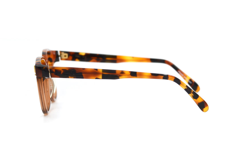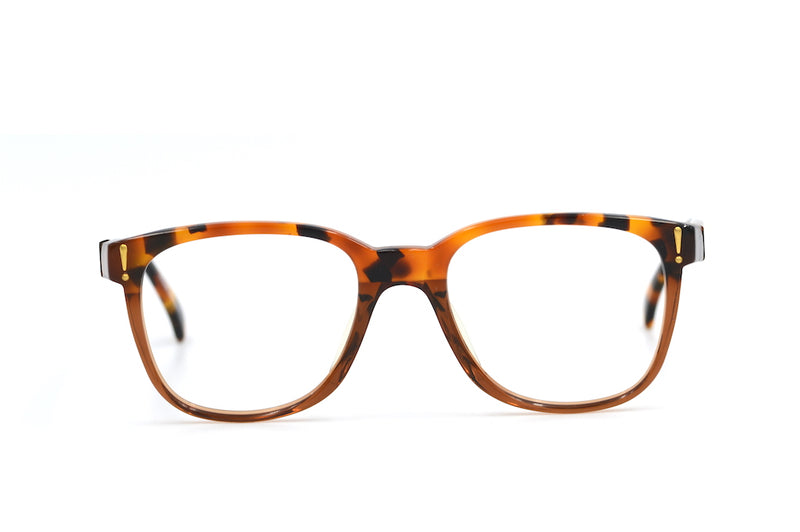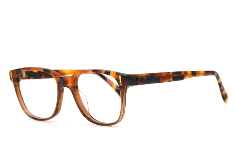 New old stock Joop! 113 vintage glasses in colour 510. Manufactured in Germany this high quality vintage frame is one to watch. Brown marbled temporal sides and brow transition into a plain brown lower rim. The exclamation mark detail famous to the brand can be seen in gold to the front temporal edges. The Joop! signature can be subtly spotted on the right temporal side. A warm autumnal frame not to be missed.