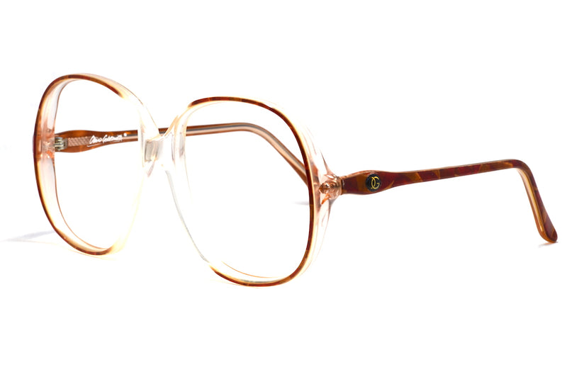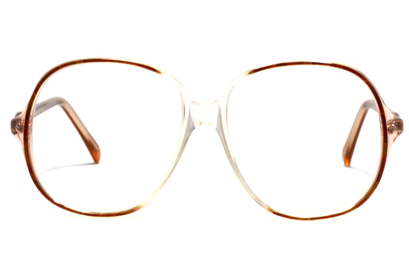 Judith by Oliver Goldsmith. Oliver Goldsmith is a family run firm since 1926. Adored by celebrity wearers including Princess Diana, Audrey Hepburn and Kate Moss, who could resist but to own such a historic and original piece of vintage eyewear. This oversized ladies acetate frame features a crystal bridge, with red and amber mottled detailing to the temporal edges and temporal sides. The classic OG emblem is present on each temple, typical of the Oliver Goldsmith brand. The frame has been made in England and is in excellent vintage condition. Not to be missed.
