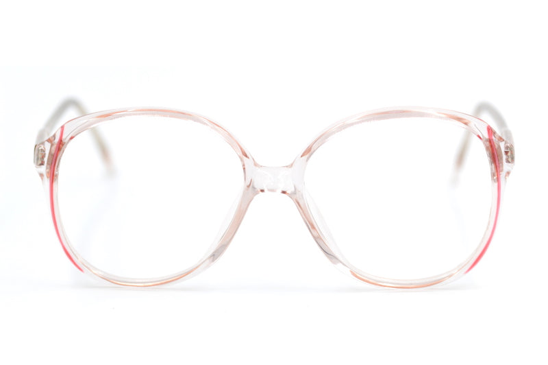 New old stock Judith by Pennine in pink. This 80s acetate frame has a slight pink hue to the crystal acetate, with brighter pink detail to the temporal edge. Oversized without being huge, a well balanced frame.