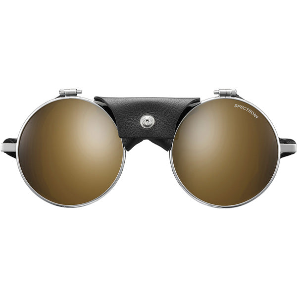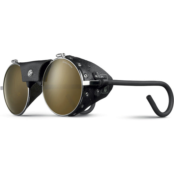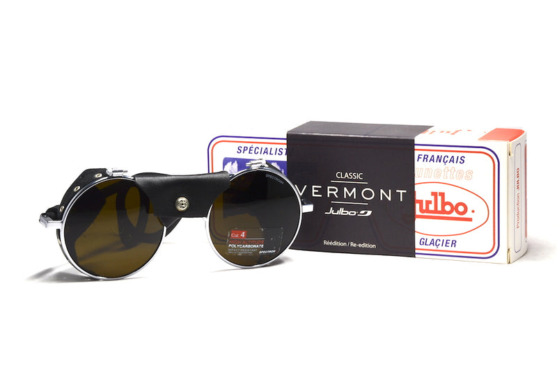 Julbo was created in 1888 under the brand name Jura, named after the founder Jules Baud. It was in 1950 that Vermont Glacier sunglasses were created for mountaineers to ascend summits with proper eye protection. Adopted by rockstars as well as mountaineers these sunglasses have remained a collectors item. Celebrating 125 years the legendary Vermont has been reissued. This traditional mountaineering/glacier sunglasses frame features the classic leather side shields for peripheral protection. The 360 degree adjustable temples allow a custom fit for added comfort. This chrome/black model comes with SPECTRON4 polycarbonate Cat.4 dark brown lenses with a flash +AR coating. These lenses are designed for use in very bright surrounds and are not suitable for driving. The anti reflective coating improves visual comfort by eliminating stray reflections. The flash coating improves visible light filtering with mirror effect lenses. Polycarbonate lenses are impact resistant adding strength and durability.