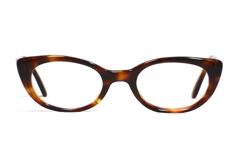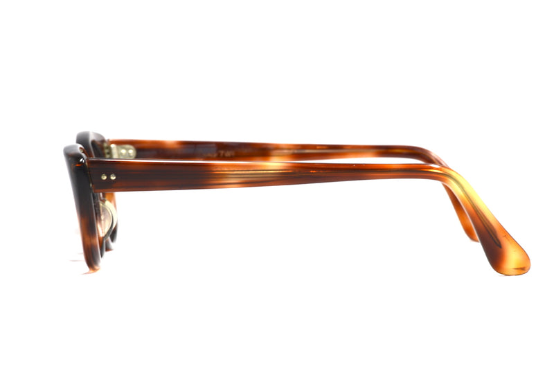 Manufactured in France we have these gorgeous L.Eviard vintage cat eye glasses. These acetate frames are brown mottled and feature silver pin head rivets to the temporal side. A simplistic yet effective frame which is subtle enough for everyday wear. This frame is in excellent vintage condition.