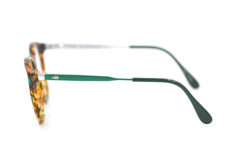 Lacoste 222 1500 petite vintage glasses, manufactured in France. This 80s design features green metal sides and a mottled acetate front. A stylish, adult frame in a petite fit.