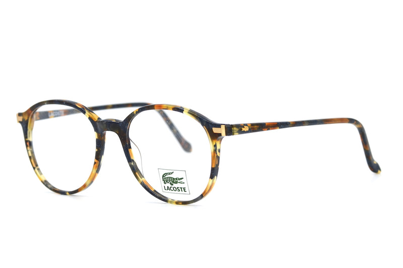 Manufactured in France we bring you Lacoste 754 vintage glasses in colour 8429. This stylish round frame has a wonderful blue and amber mottling to the acetate. Gold detail can be seen to the temporal edge with the Lacoste emblem. Stylish sustainable eyewear at Retro Spectacle.