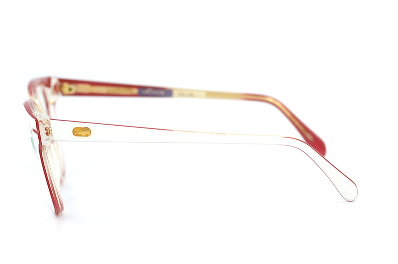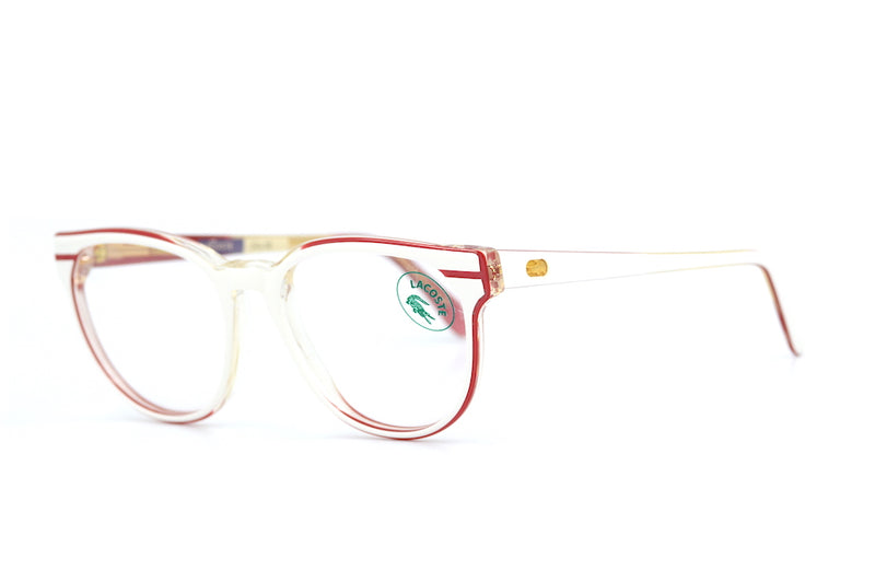 New old stock Lacoste 804 vintage glasses. Manufactured in France in the 90's these acetate frames are white with red edging. The rounded bottom softens the frame. The crocodile emblem is featured on each temporal side. A casual frame from the sporting brand Lacoste. This frame is available numerous sizes and colours.
